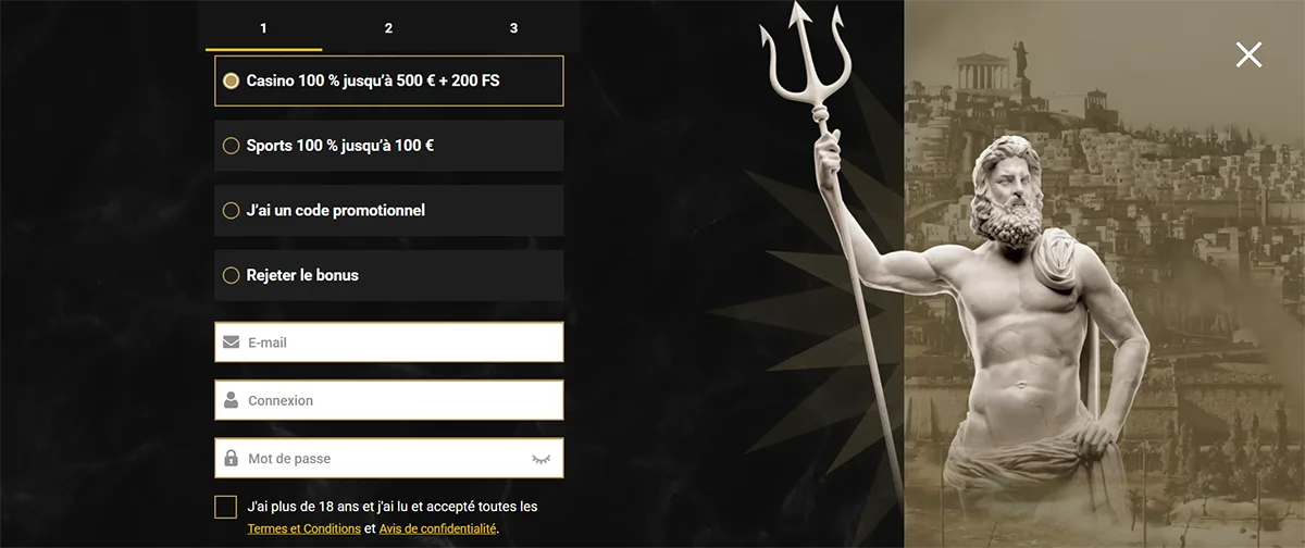 Sélectionnez le bonus de bienvenue qui vous intéresse. Nous offrons 100% jusqu'à 500€ + 200 tours gratuits pour bien commencer votre aventure.